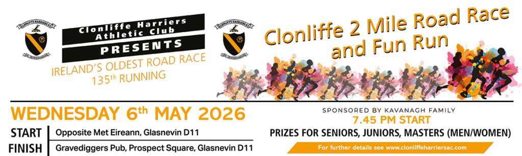 The race will be sponsored this year by the Kavanagh family in Glasnevin. The late Eugene Kavanagh commenced sponsoring this race back in the club’s centenary year 1986.  Clonliffe Harriers are very grateful to the Kavanagh family for their continuing sponsorship of this event