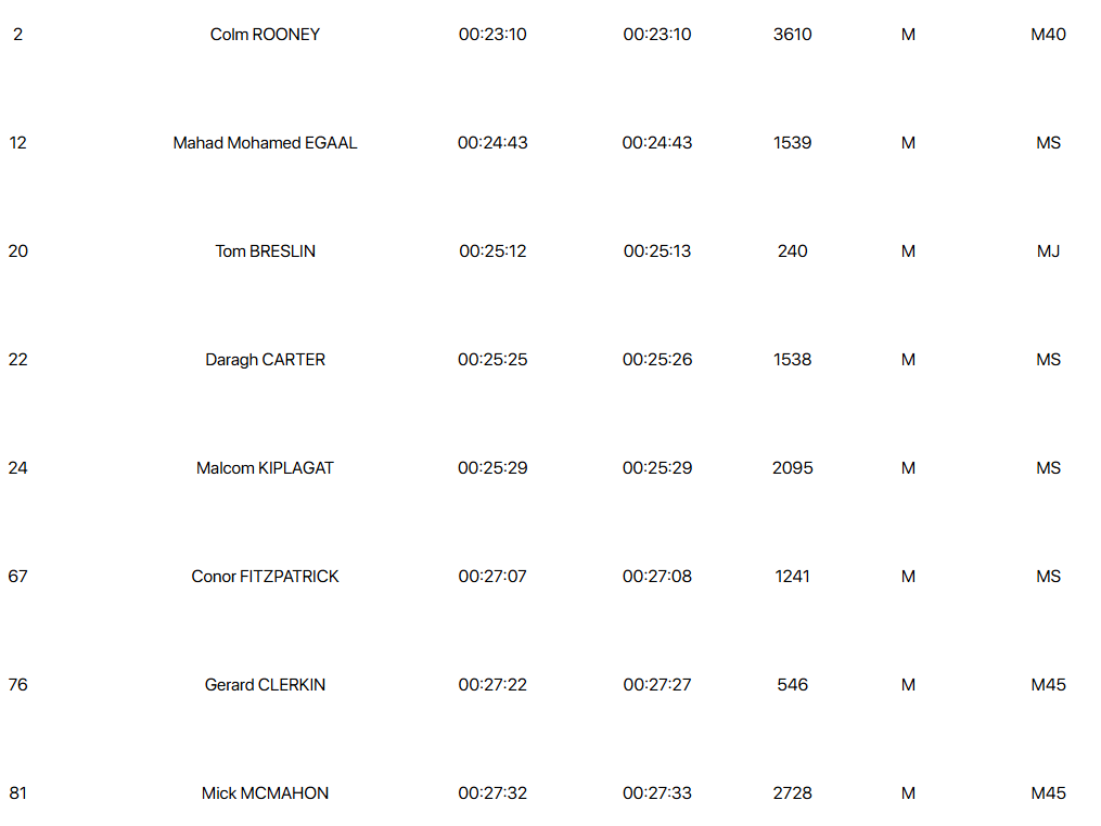 Once again the Raheny 5 had not only the quantity but real quality lining up for this 42nd running of the race. The lead pack tore through the 1st mile with Colm Rooney, Tom Breslin and Mahad Mohamed Egaal well to the fore. The pack also included several of the pre-race favourites, Hugh Armstrong (Ballina) , Jonas Stafford (UCD) and Ryan Creech (Leevale). As the leaders came back into view with only about 600 to go it was Stafford who led but with Colm Rooney on his shoulder, Rooney made a big effort at about 300 and hit the front however Stafford held his nerve and out kicked the Clonliffe man on the run into the line. Colm took 2nd place in a superb 23.10. Next in was Mahad in 12th position (24.43) and in 20th Tom Breslin (25.12) completing the scoring 3 on 34 points to take 1st place in the team event, well clear of Donore 56 points and the home team on 75 points. Excellent running by not only the scoring 3 by the other members of the senior team: Darragh Carter (25.25), Malcom Kiplagat (25.29) and Conor Fitzpatrick (27.07).