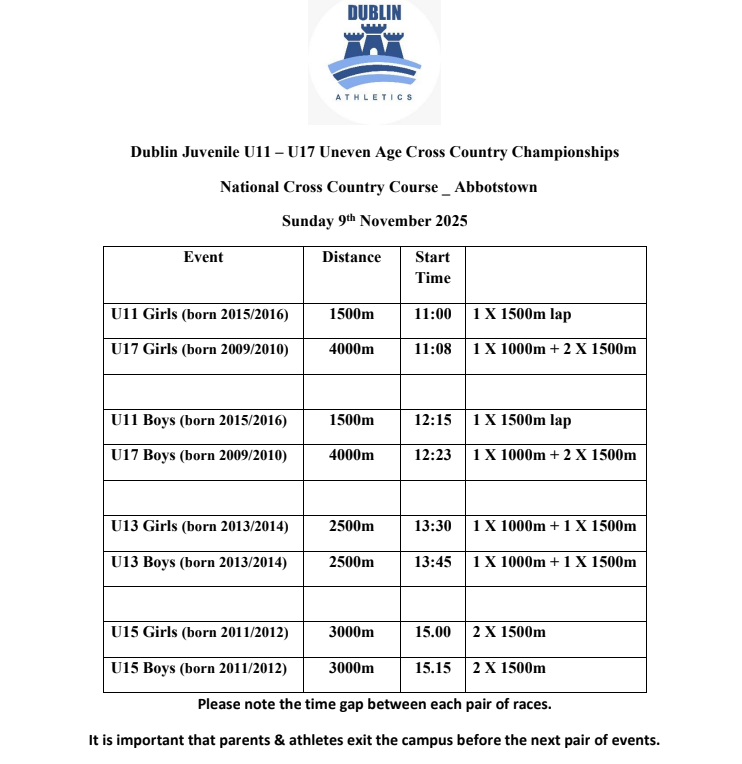 The Dublin juvenile cross country championships for age groups U/11, U/13, U/15 and U/17 will take place this Sunday, November 9, at the national cross country course in Abbottstown. The U/19’s will be running in conjunction with the Leinster cross country at Kilbeggan Racecourse on Saturday with the U/9s to be run in conjunction with the juvenile cross country league in Tymon Park on November 16.