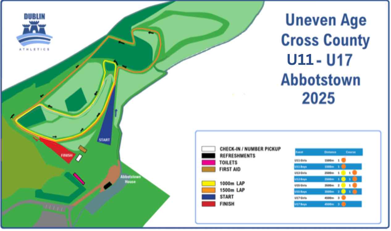 The Dublin juvenile cross country championships for age groups U/11, U/13, U/15 and U/17 will take place this Sunday, November 9, at the national cross country course in Abbottstown. The U/19’s will be running in conjunction with the Leinster cross country at Kilbeggan Racecourse on Saturday with the U/9s to be run in conjunction with the juvenile cross country league in Tymon Park on November 16.