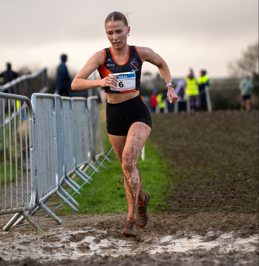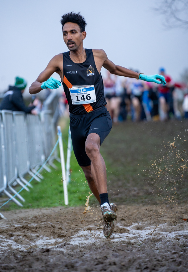 We’ll start this report at the end: the senior men’s national, once again held over a distance of 7500m and encompassing 5 x 1500 laps. From the starters gun the field tore down the starting straight and after roughly 200 headed through the flowing river of mud to take in the 1st lap out in the country with the pack headed by Efrem Gidey who has certainly gotten out faster than more recent nationals. Efrem’s lead was, however, short lived as he was caught by the group containing all the favourites – Mullingar Harriers pairing of Jack O’Leary and Cormac Dalton, Brian Fay (Raheny), Darragh McElhinney (Bantry) and CNDR Track’s Nick Griggs. It was a brilliant race to watch I was only on the final lap that the medal positions became clear as Dalton drove on with Fay and Griggs on his shoulder. It was the Raheny man who captured the national title making use of his blistering kick down the grassed home straight. Griggs took 2nd with Dalton 3rd. Efrem was 6th, but with Griggs being U/23 was 5th senior, so fingers crossed that he gets that coveted European Cross Country place.