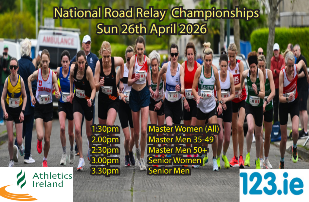 The national road relays return once again to Raheny on Sunday next, April 26. The action gets underway at 1:30 PM with the master women’s race (1 x 2 x 1 miles), same former for all races except the senior men’s race at 3:30 PM which is 2 x 1 x 3 x 2 miles. Once again there is very strong representation by Clonliffe Harriers with some 17 teams entered in all.