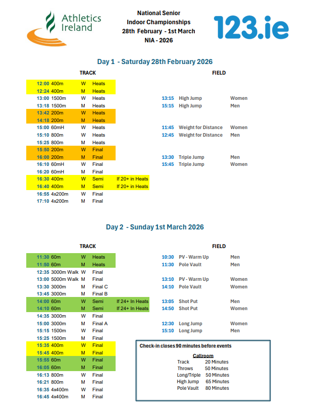 Please note that entry is by ticket only. There is a live stream on Saturday with Virgin TV covering Sunday’s finals – further details see: https://www.athleticsireland.ie/competitions-events/fixtures-results/national-senior-indoor-championships-2/