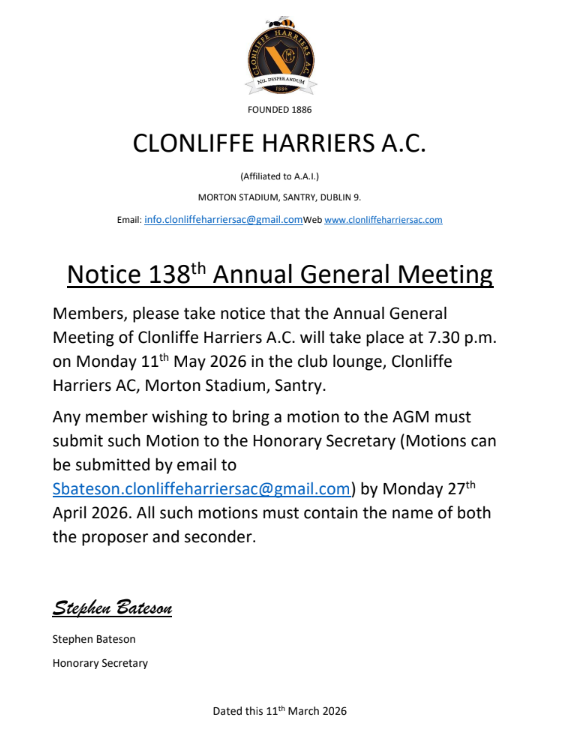 11 April, 2026 Annual General Meets Notice of AGM: May 11th The Club Secretary has given notice that the Club’s AGM will take place on May 11th. See notice below:
